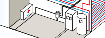 Der Kurzzeitspeicher, 800 oder 1000 Liter Inhalt, wird kompakt mit allen Steuermodulen im Betriebsraum installiert. Wärmetauscher heizen den Speicher bis zu 75°C auf; gespeist werden sie von einem  Solarkollektorkreis und der Wärmepumpe.